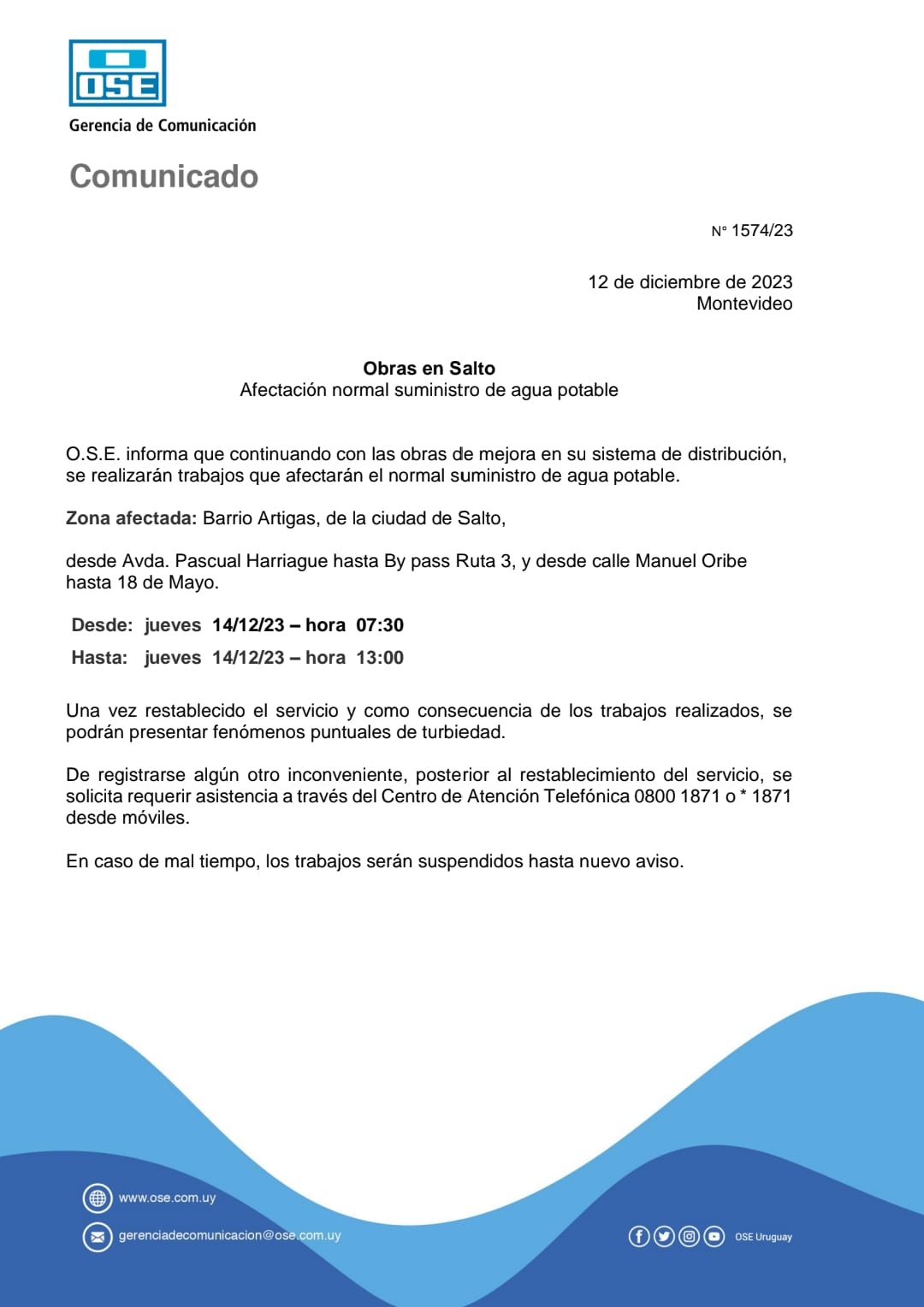 OSE anuncia afectación del normal suministro de agua potable en barrio Artigas este jueves 12 diciembre, 2023