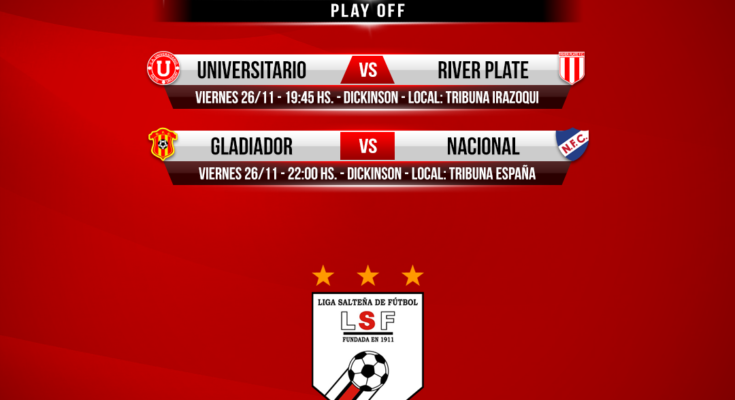 Se fijaron dos de los tres partidos play off de la divisional «A» para el viernes 26 de noviembre en el estadio Ernesto Dickinson, el primero será Universitario – River Plate a las 19.45 horas y luego a las 22 horas jugaran Gladiador – Nacional.