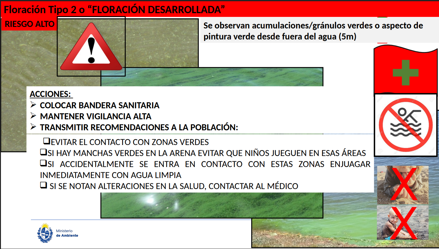 Tras los controles realizados, se detectó una floración tipo 2 (floración desarrollada), lo que motivó la colocación de la bandera sanitaria. La señalización sanitaria se encuentra disponible de forma virtual, debido a las características cambiantes de este tipo de eventos.