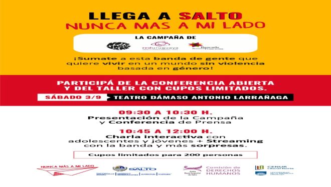 Este sábado 3 de setiembre a la hora 9.30 se presenta en el Teatro Larrañaga la campaña «Nunca más a mi lado», que busca colocar a la violencia de género como problema social que nos involucra a todos y todas y desarrollar acciones de prevención, enfocadas especialmente en las nuevas generaciones.