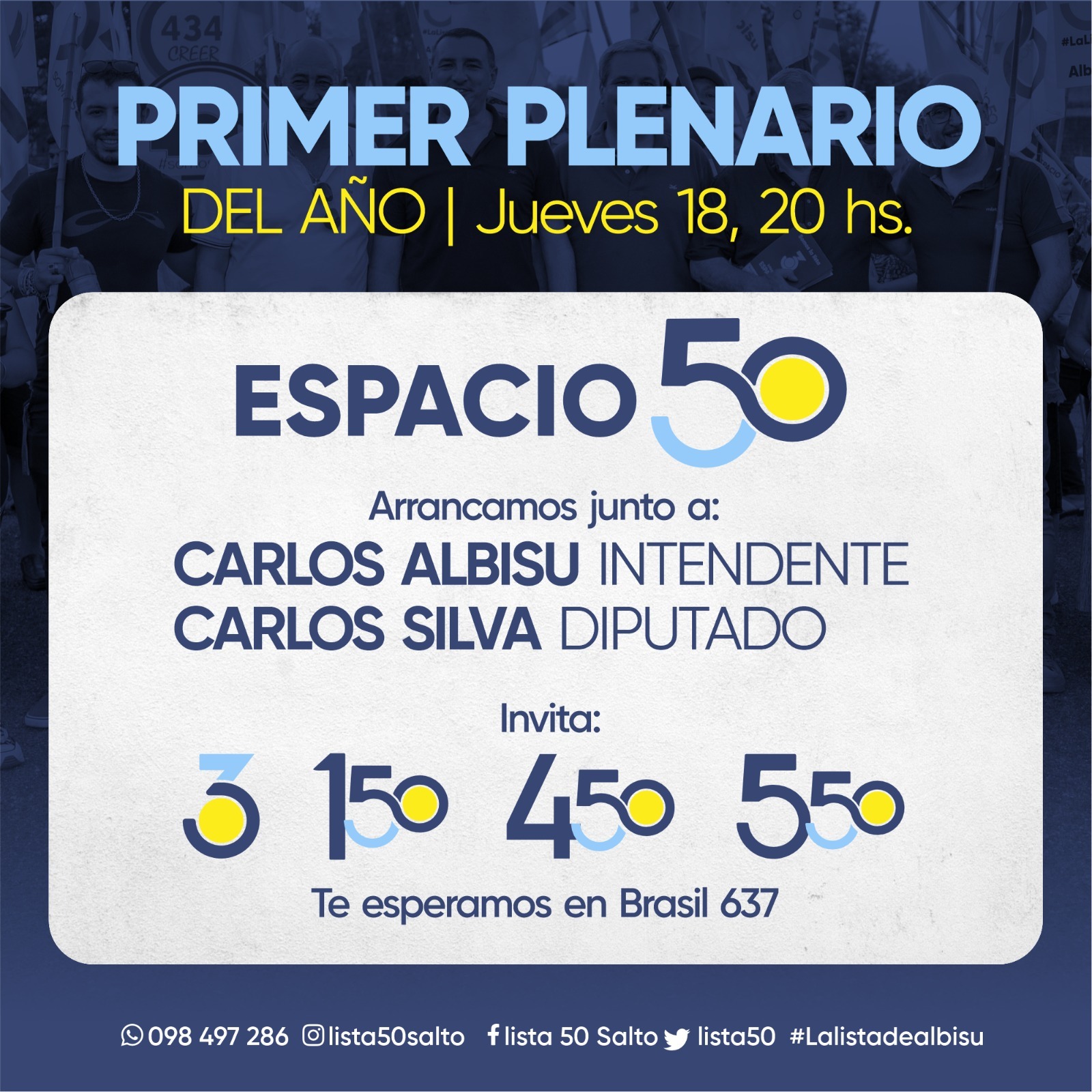 Contaremos con la presencia del candidato a Intendente Carlos Albisu y el candidato a Diputado Carlos Silva como oradores.