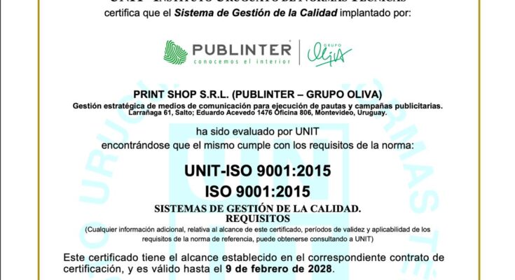 Este importante logro posiciona a PUBLInter como la primera empresa de comunicación del Interior del Uruguay en certificar bajo esta norma internacional, que reconoce la excelencia en procesos, la mejora continua y la orientación al cliente.