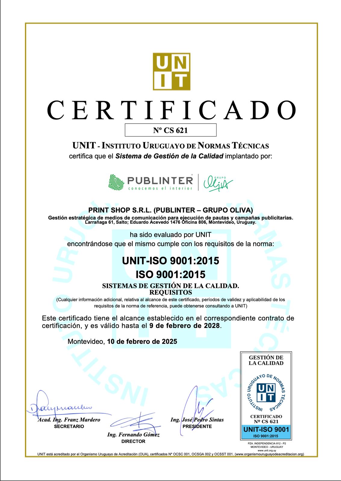 La central de medios PUBLInter, especializada en la planificación y ejecución de campañas publicitarias en el Interior del país, acaba de obtener la certificación internacional UNIT-ISO 9001:2015, que avala la calidad de su Sistema de Gestión Estratégica de Medios.