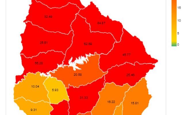 Uruguay tiene once departamentos en nivel rojo por COVID-19, según el Índice de Harvard, lo que quiere decir que en el promedio de casos nuevos en los últimos días se registraron más de 25 casos diarios cada 100.000 habitantes.