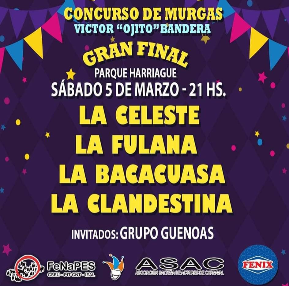 Se conocen las finalistas del Concurso de Murgas Salto 2022 28 febrero, 2022 - Dejar un comentario Las murgas que pasaron a la final sábado 5 marzo y cantan por este orden: La Celeste La Fulana La Bacacuasa La Clandestina Hora de comienzo 21.
