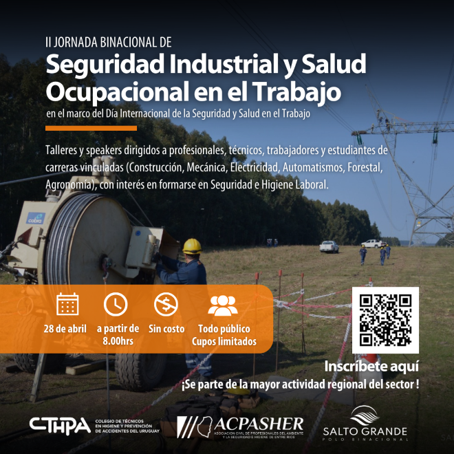 Como parte de la agenda de formación impulsada por el Polo Binacional Salto Grande, inicia la Segunda Jornada Binacional de Seguridad Industrial y Salud Ocupacional en el Trabajo, con participación de técnicos, empresas, colegio de profesionales y representantes del sector. Cabe destacar que en 2022, la primera edición contó con más de 750 participantes de ambos países (Argentina y Uruguay).