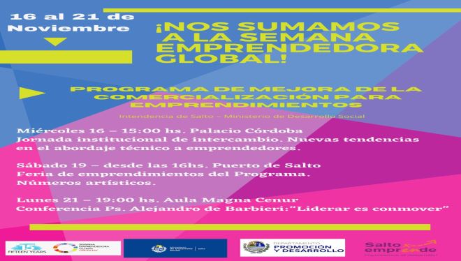 En el marco del Convenio que se viene llevando a cabo entre Mides Emprendimiento Productivo y Redes – Intendencia desde la Dirección de Promoción y Desarrollo de la Intendencia de Salto a través del programa Salto Emprende, se prevén llevar adelante 3 actividades en la Semana Emprendedora Global.