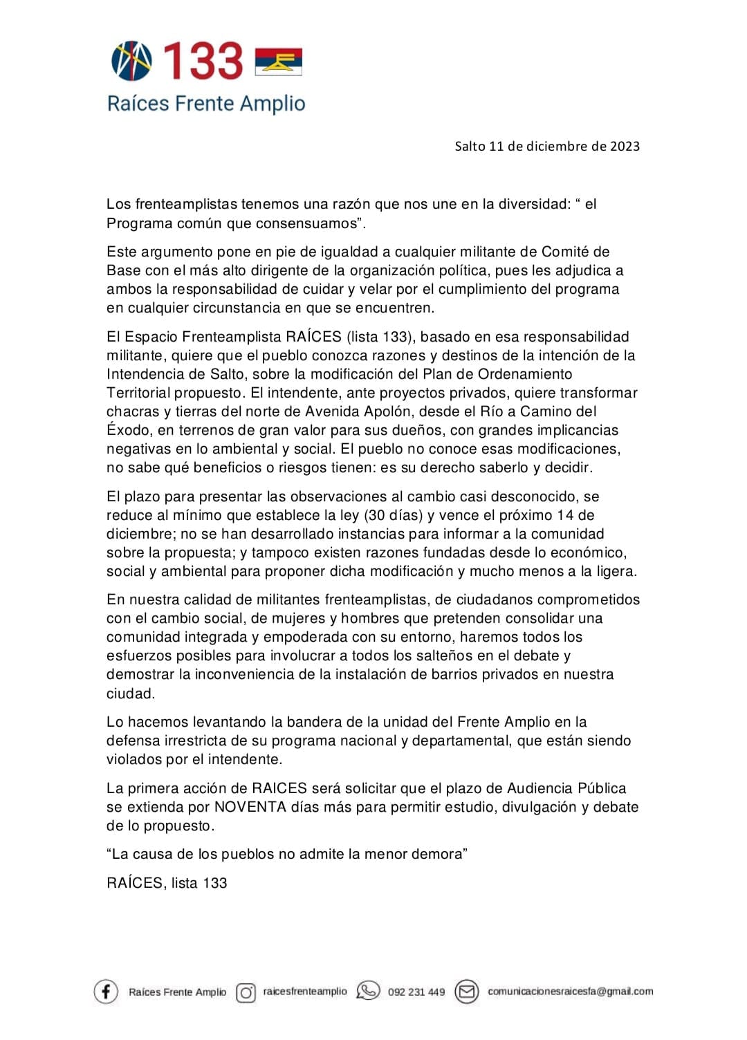 Ayer, miembros del espacio Raíces del Frente Amplio se presentaron en la Intendencia de Salto para entregar un documento dirigido al Intendente Andrés Lima. En este documento, solicitan una prórroga para la audiencia pública en el marco del proceso de modificación del plan de ordenamiento territorial. La razón es que el plazo para la presentación de la documentación vence hoy.