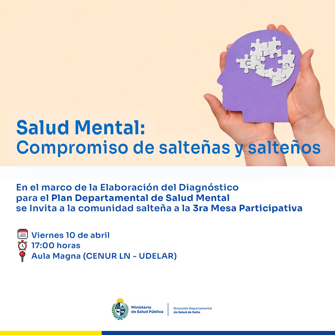 La tercera mesa de trabajo en el marco de la elaboración del diagnóstico para el Plan Departamental de Salud Mental se llevará a cabo el viernes 10 de abril, a las 17:00 horas, en el Aula Magna de la Universidad de la República, bajo modalidad presencial.