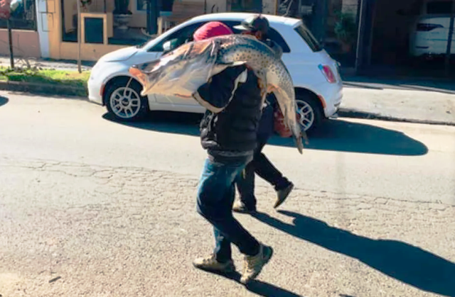 Camino a su casa, la escena del hombre con el producto de su pesca al hombro llamó la atención de los vecinos que le sacaron fotos y las compartieron en sus redes sociales.