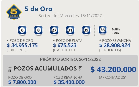 Un solo apostador de Salto se quedó con el pozo de oro de 34.955.175 pesos 17 noviembre, 2022 - Dejar un comentario El pozo de oro cayó en Salto, se lo llevó un solo apostador.