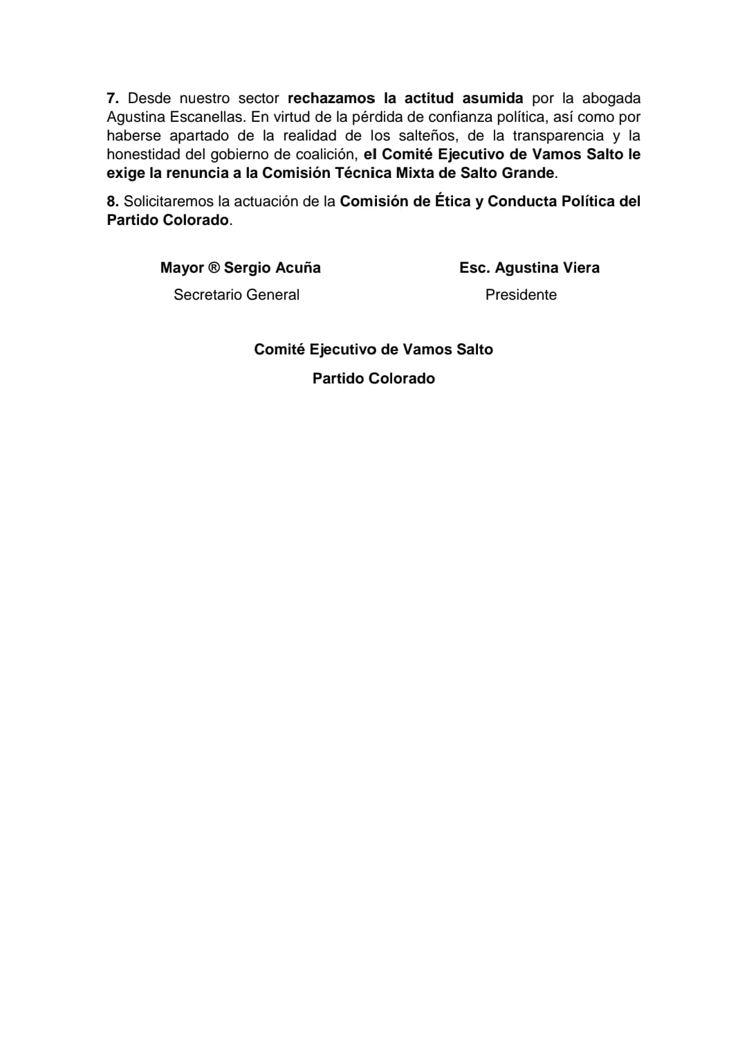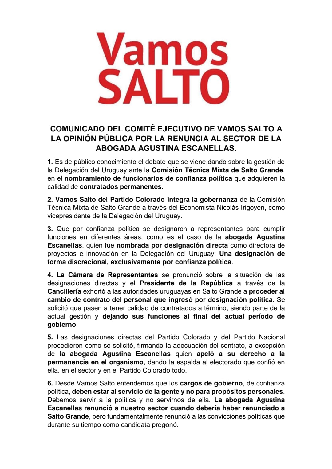 Vamos Salto rechaza la actitud de Agustina Escanellas quien renunció al sector cuando debería haber renunciado a Salto Grande 31 octubre, 2023 - Dejar un comentario