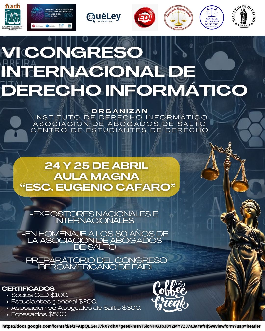 El VI Congreso Internacional de Derecho Informático, organizado por el Instituto de Derecho Informático, el Centro de Estudiantes de Derecho de Salto y la Asociación de Abogados de Salto, se consolida como un espacio académico de referencia en torno a los desafíos que la transformación digital plantea al Derecho contemporáneo.
