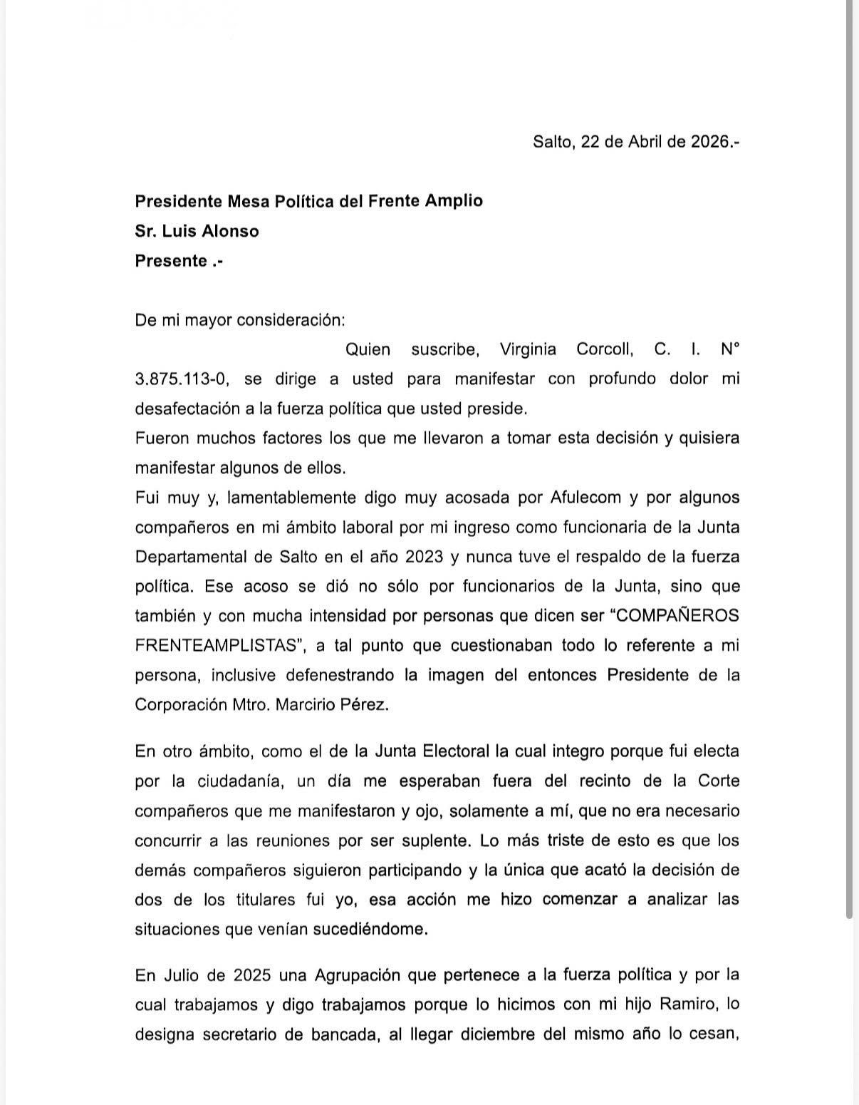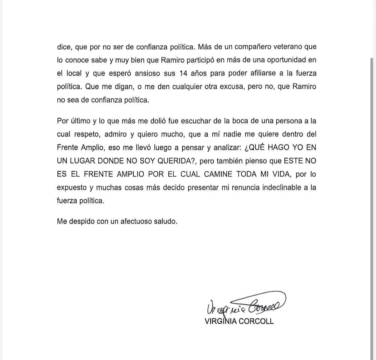 Virginia Corcoll renunció al Frente Amplio denunciando falta de respaldo y situaciones de acoso 23 abril, 2026 Screenshot Screenshot