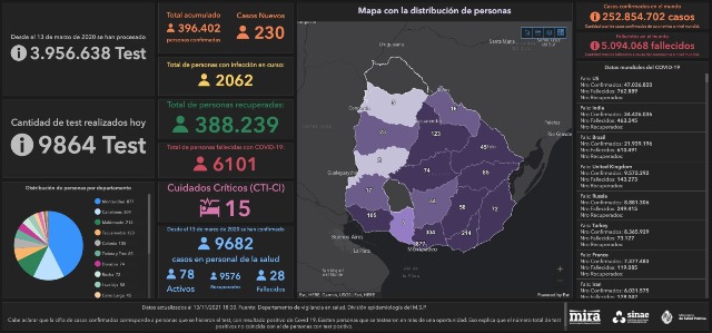 De los 230 nuevos casos, 81 son de Montevideo, 45 de Canelones, 22 de Maldonado, 18 de Rocha, 15 de Colonia, 10 de Durazno, 10 de Tacuarembó, 7 de Cerro Largo, 7 de Lavalleja, 4 de Rivera, 4 de Treinta y Tres, 2 de Florida, 1 de Paysandú, 3 de Salto y 1 de Soriano.