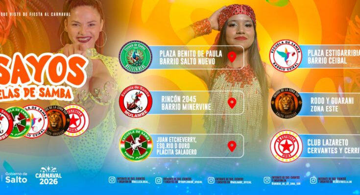 Las Escuelas de Samba de Salto ya se preparan para el Carnaval de Salto 2026 y dieron a conocer sus distintos lugares de ensayo, para que el público los acompañe en cada ocasión y ya se vaya viviendo la gran fiesta popular del departamento, que este año viene con todo.